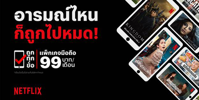 เน็ตฟลิกซ์ประกาศแนะนำแพ็คเกจบริการใหม่ล่าสุดสำหรับผู้ใช้สมาร์ทโฟนและแท็บเล็ตในประเทศไทย เพื่อเปิดให้ผู้ชมได้สนุกเพลิดเพลินไปกับภาพยนตร์และซีรีส์คุณภาพมากมายแบบไม่มีโฆษณาคั่น บนหน้าจอโทรศัพท์มือถือหรือแท็บเล็ตทีละหนึ่งเครื่องต่อบัญชีผู้ใช้ ที่ราคาเพียง 99 บาทต่อเดือน โดยแพ็คเกจมือถือนี้ นับเป็นแพ็คเกจที่ 4 ที่เปิดให้บริการในประเทศไทย ถัดจากแพ็คเกจพื้นฐาน มาตรฐาน และพรีเมียมที่มีอยู่เดิม