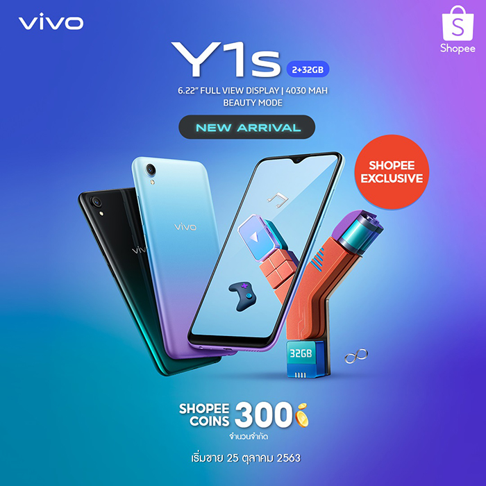 Vivo แบรนด์สมาร์ตโฟนชั้นนำระดับโลก ส่ง Y1s สมาร์ตโฟนรุ่นเล็กสเปกเทพมาเขย่าวงการตลาดมือถือราคาประหยัดให้คึกคักอีกครั้งในราคาสุดพิเศษที่ 2,999 บาท พร้อมดีลสุดคุ้มสำหรับผู้ที่สั่งซื้อผ่านทาง Vivo Official Store บนแอปพลิเคชัน Shopee หรือ Electronics By Shopee รับทันที Shopee coin สูงสุด 300 coins