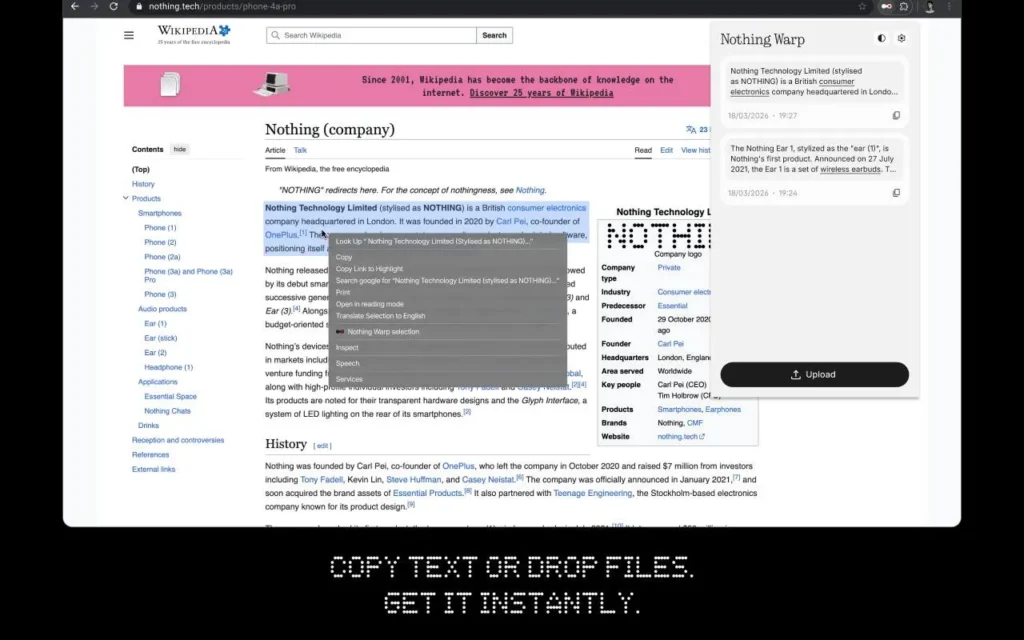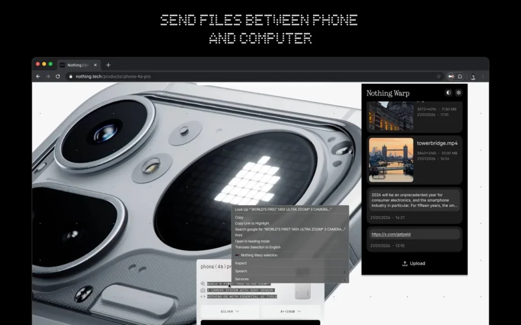 Nothing Warp คือโซลูชันใหม่ที่ช่วยให้การส่งไฟล์, ลิงก์, ข้อความที่คัดลอกไว้ หรือรูปภาพ ระหว่างอุปกรณ์เป็นไปอย่างราบรื่น (Seamless) โดยไม่ต้องพึ่งสายเคเบิลหรือขั้นตอนที่ยุ่งยาก
