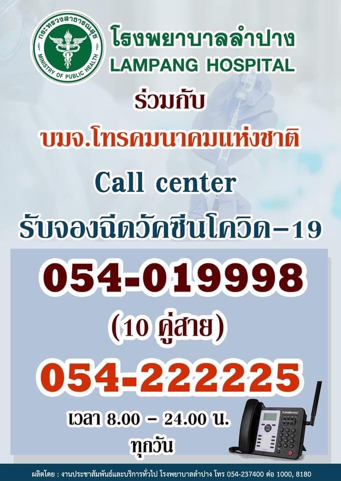 NT สนับสนุนระบบเทคโนโลยีสื่อสารโทรคมนาคม Cloud PBX, VDO Phone และ Data Center เพิ่มศักยภาพโรงพยาบาล รองรับความต้องการประชาชนจองฉีดวัคซีนโควิด-19 นำร่อง รพ.ลำปาง รพ.ปิยะเวท ก่อนขยายพื้นที่อื่นทั่วประเทศ