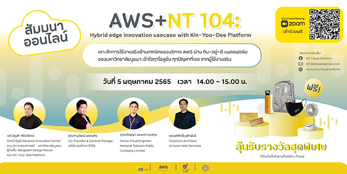 บริษัท โทรคมนาคมแห่งชาติ จำกัด (มหาชน) (NT) ร่วมกับบริษัท อะเมซอน เว็บ เซอร์วิสเซส (ประเทศไทย) (AWS) ชวนนักพัฒนาสายคลาวด์และบิ๊กดาต้าร่วมสัมมนาฟรีออนไลน์ ”AWS+NT 104 : Hybrid edge innovation usecase with Kin-Yoo-Dee Platform” เสริมความรู้ต่อยอดเชิงเทคนิคของบริการ AWS Cloud ผ่านกรณีศึกษาผลงานนวัตกรรมของมหาวิทยาลัยบูรพาที่ใช้งานจริง “กิน-อยู่-ดี แพลตฟอร์ม”