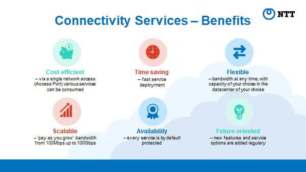 พร้อมเดินหน้าให้บริการออกแบบระบบการทำงานบนคลาวด์ และบริการด้านบริหารจัดการแบบครบวงจรเพื่อเชื่อมต่อการทำงานผ่านเอ็นทีที โกลบอล ดาต้าเซ็นเตอร์ อินเตอร์คอนเนค (NTT Global Data Center Interconnect : GDCI) ซึ่งเป็นบริการโครงสร้างเครือข่ายแบบบูรณาการไปยังทั่วโลกที่เป็นส่วนตัวและปลอดภัย
