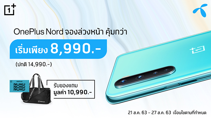 พบกับข้อเสนอสุดพิเศษจากดีแทค เปิดจอง OnePlus Nord ในราคาเริ่มต้นเพียง 8,990 บาท โดยดีแทคพร้อมเปิดจองแล้วที่ศูนย์บริการดีแทคที่ร่วมรายการ ตั้งแต่วันนี้ – 27 สิงหาคม 2563 พร้อมกันนี้ยังได้รับของสมนาคุณสุดคุ้มจาก จาก OnePlus ทั้ง OnePlus Nord E-VIP CARD ประกันหน้าจอแตก 1 ครั้งนาน 1 ปี และ กระเป๋า OnePlus รวมมูลค่า 10,990 บาท โดยของแถมมีจำนวนจำกัด