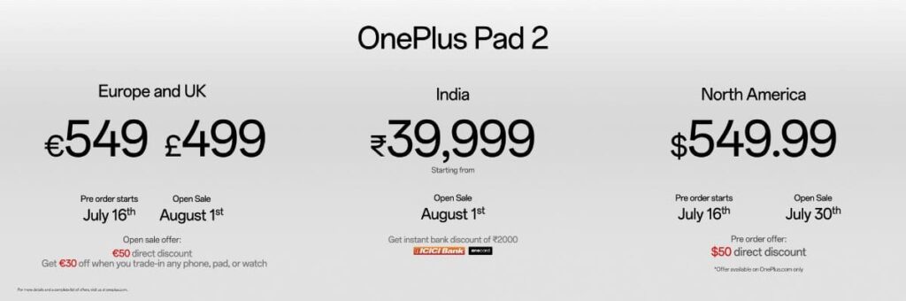 ทั้งนี้ OnePlus Pad 2 มีสีเดียวคือ Nimbus Gray โดยมีราคาอยู่ที่ 550 ดอลลาร์สหรัฐ/550 ยูโร/500 ปอนด์/39,999 รูปี หรือประมาณ 19,780/21,540/23,330/17,210 บาท วางจำหน่ายในสหรัฐอเมริกาวันที่ 30 กรกฎาคม ในขณะที่ยุโรปและอินเดียจะวางจำหน่ายในวันที่ 1 สิงหาคม