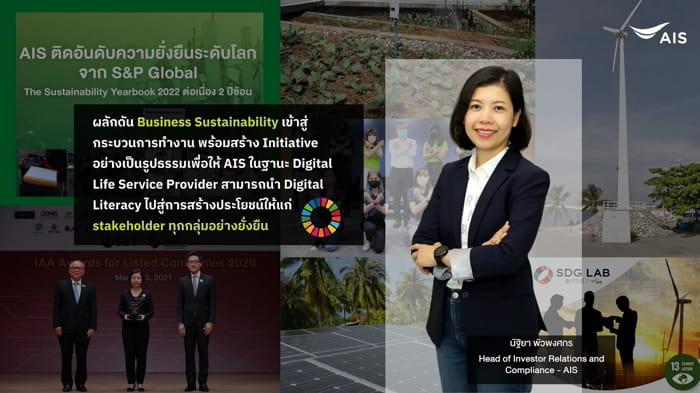 นัฐิยา พัวพงศกร หัวหน้าฝ่ายงานนักลงทุนสัมพันธ์และกำกับดูแลการปฏิบัติงาน AIS มองว่า “ในฐานะที่ทำงานด้านนโยบายภาพรวมด้านความยั่งยืนที่เกี่ยวข้องกับ Stakeholder ทั้งภายในและภายนอกองค์กร เพื่อผลักดันทิศทางของบริษัทให้เกิดการเติบโตอย่างยั่งยืน การทำงานร่วมกับหลายหน่วยงานและหลากกลุ่มบุคคลต้องบริหารความเข้าใจของทุกฝ่าย เพื่อสร้างสมดุลระหว่างคนทำงานและทิศทางของบริษัท เป้าหมายด้านความยั่งยืนในแต่ละด้านไม่ว่าจะเป็นการพัฒนานวัตกรรมและเศรษฐกิจดิจิทัล
