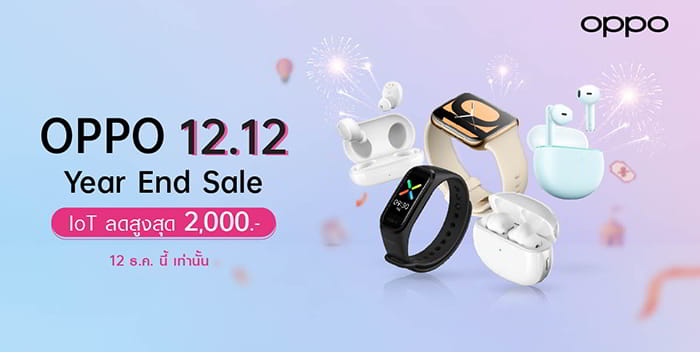 OPPO แบรนด์สมาร์ทโฟนชั้นนำในไทย พร้อมมอบความสุขส่งท้ายปี จัดโปรโมชันสุดเซอร์ไพรส์เอาใจสาย Gadget ผ่านแคมเปญ “OPPO 12.12 Year End Sale” มอบส่วนลดอุปกรณ์ IoT สูงสุดถึง 2,000 บาท! ครอบคลุมทั้งหูฟังไร้สายอัจฉริยะ สมาร์ทวอร์ซ และสมาร์ทแบนด์ ห้ามพลาด! เฉพาะวันที่ 12 ธันวาคม 2564 วันเดียวเท่านั้น ที่ OPPO Official Store บน Lazada, Shopee และ JD Central