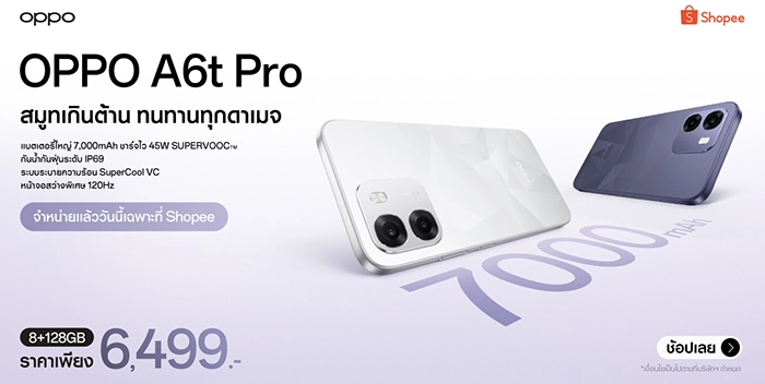 ห้ามพลาด! เป็นเจ้าของความคุ้มค่าได้แล้ววันนี้กับสมาร์ตโฟน OPPO A6t Series โดย OPPO A6t ราคาเริ่มเพียง 3,499 บาท จำหน่ายเฉพาะช่องทางออนไลน์บนเว็บไซต์ OPPO Store และสามารถเป็นเจ้าของ OPPO A6t Pro มาในราคาเพียง 6,499 บาท โดยมีจำหน่ายเฉพาะช่องทาง Shopee เท่านั้น ตั้งวันนี้ – 24 ก.พ. 69 นี้เท่านั้น!