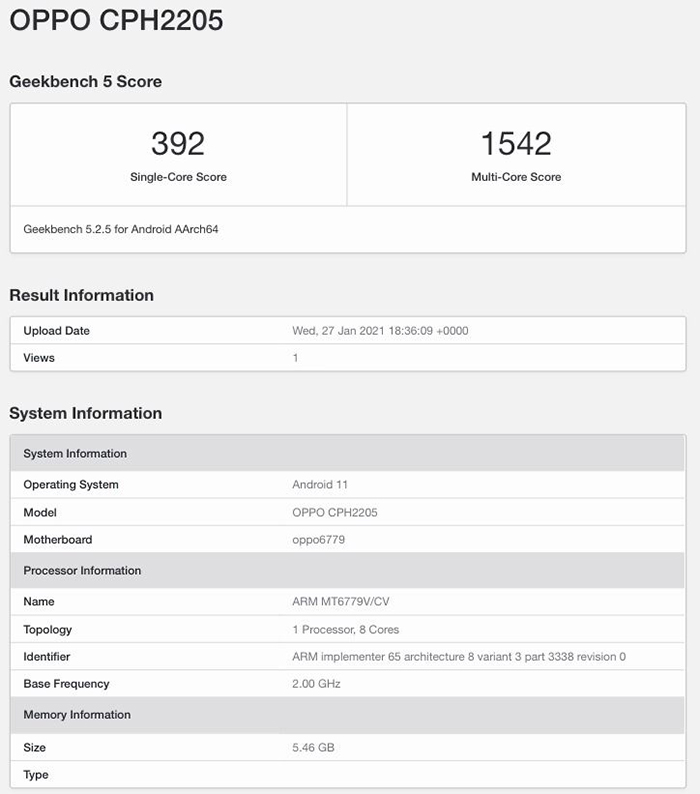 มีรายงานว่ามีการพบผลทดสอบประสิทธิภาพของสมาร์ตโฟน OPPO หมายเลขรุ่น CPH2205 บนแอป GeekBench โดยมาพร้อมชิปเซ็ท MediaTek Helio P95 SoC ล่าสุดจับคู่กับ RAM 6GB ซึ่งคาดว่าจะเป็นสมาร์ตโฟนในตระกูล A Series รุ่นใหม่ของ OPPO