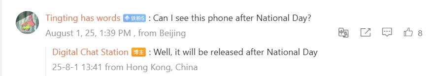 ในส่วนความคิดเห็นของโพสต์ Digital Chat Station เสริมว่า Find X9 จะเปิดตัวหลังวันชาติจีน ซึ่งตรงกับวันที่ 1 ตุลาคม ซึ่งหมายความว่าการเปิดตัวน่าจะมีกำหนดจัดขึ้นในเดือนตุลาคม