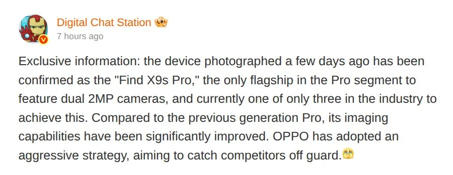 Digital Chat Station (DCS) จอมแม่นแห่งวงการไอทีจีน ได้โพสต์ผ่าน Weibo ยืนยันว่าสมาร์ตโฟนรุ่นนี้จะใช้ชื่อว่า “OPPO Find X9s Pro” ไม่ใช่ X9s ธรรมดา