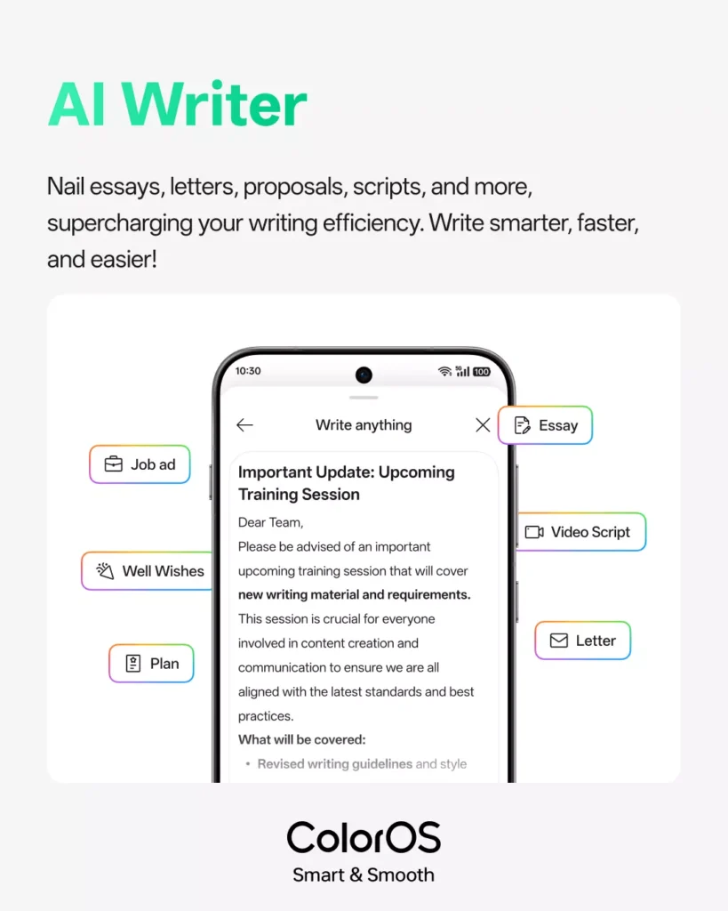 - AI Writer: ผู้ช่วยเขียนอัจฉริยะที่ฝังมาในระบบ ช่วยร่างข้อความ ตอบอีเมล หรือสรุปเนื้อหาให้สั้นกระชับได้ทันที โดยทำงานร่วมกับแอปสื่อสารยอดนิยมได้แทบทุกแอป