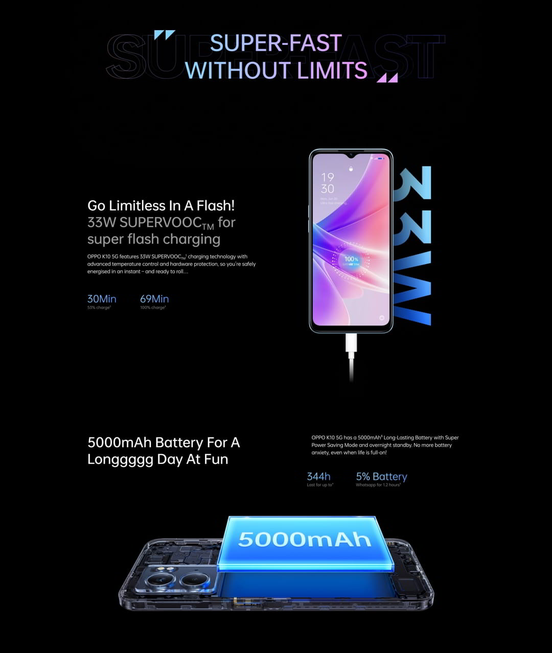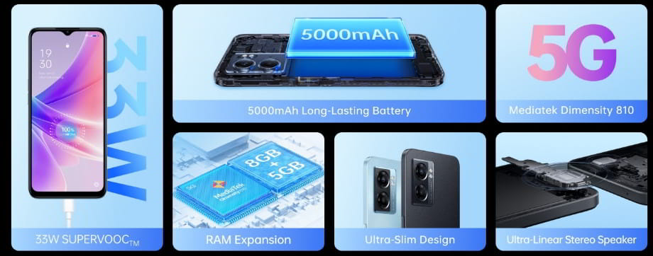 รวมทั้งติดตั้งเซ็นเซอร์สแกนลายนิ้วมือที่ด้านข้างเครื่อง, ลำโพงคู่สเติริโอ, รองรับ 2 SIM, รองรับ 4G LTE/5G Dual Band (SA/NSA), Wi-Fi 802.11 a/b/g/n/ac, dual-band, Wi-Fi Direct, hotspot, Bluetooth 5.1, พอร์ต USB Type-C และใช้แบตเตอรี่ความจุ 5,000mAh รองรับการชาร์จเร็ว 33W SuperVOOC