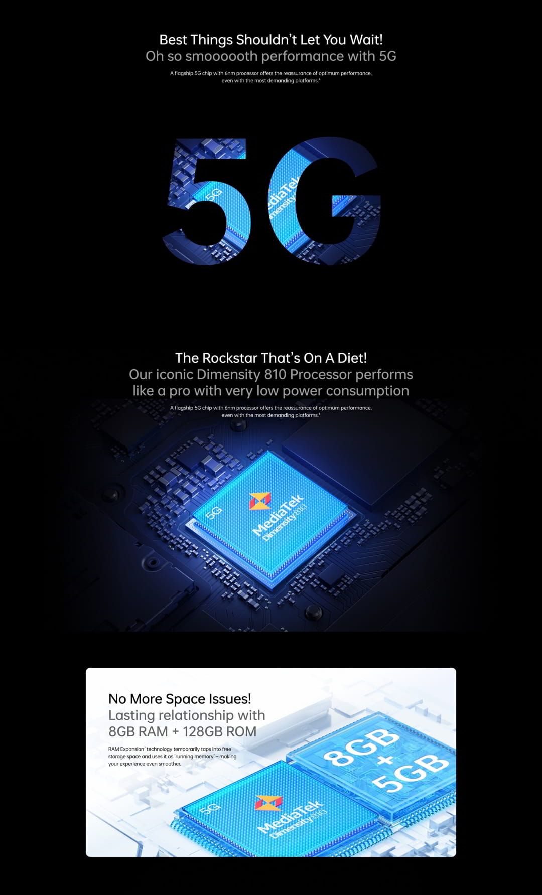 ใช้หน่วยประมวลผลซีพียูแบบ Octa Core ความเร็ว 2.4GHz โดยใช้ชิปเซ็ท MediaTek Dimensity 810 5G SoC, หน่วยประมวลผลกราฟิก Mail-G57, RAM 8GB, หน่วยความจำภายใน 128GB เพิ่มได้ด้วย microSD Card และรันบนระบบปฎิบัติการ Android 12 ครอบทับด้วย ColorOS 12.1