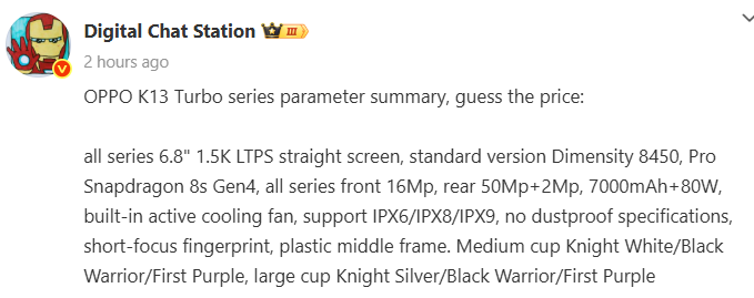 Digital Chat Station และ Bald Panda สองแหล่งข่าวหลุดสมาร์ตโฟนได้โพสต์ผ่านบัญชี Weibo ส่วนตัวเผยข้อมูลสเปกเต็มของ OPPO K13 Turbo และ K13 Turbo Pro