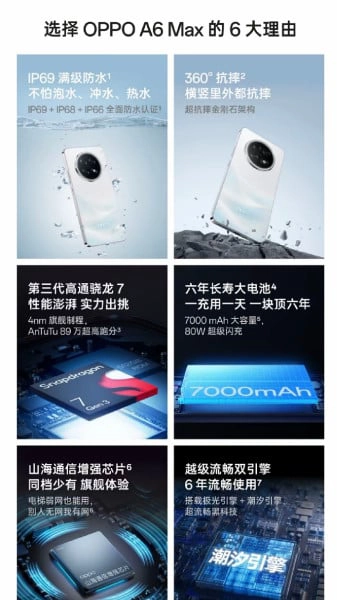 จุดเด่นที่สุดของ OPPO A6 Max คือความทนทาน ตัวเครื่องผ่านมาตรฐานการป้องกันฝุ่นและน้ำถึง 3 ระดับคือ IP66, IP68 และ IP69 ซึ่งหมายความว่าสามารถทนทานต่อการฉีดน้ำแรงดันสูงและอุณหภูมิสูงได้ เหมาะสำหรับทุกสภาพการใช้งานที่สมบุกสมบัน