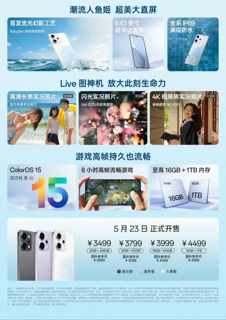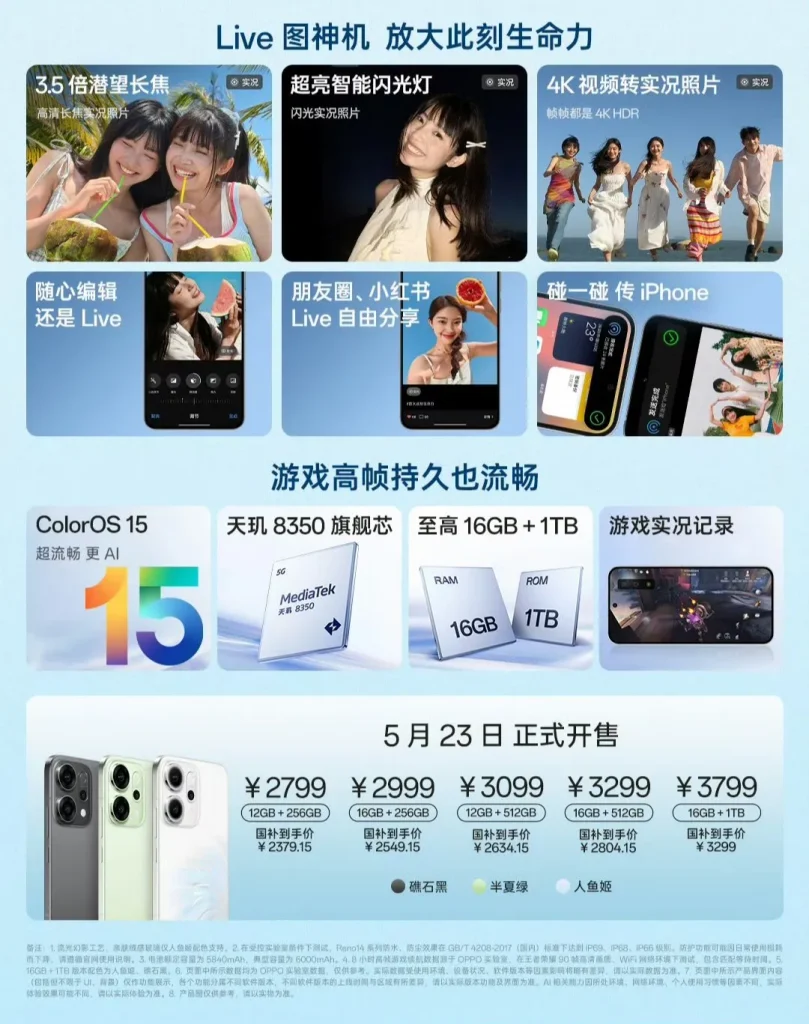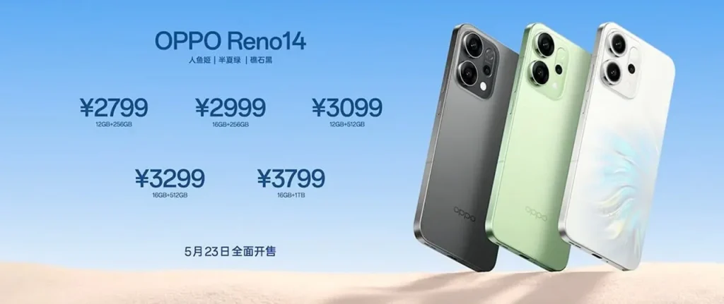 ทั้งนี้ OPPO Reno 14 มีให้เลือก 3 สีคือสี Mermaid, Half Summer Green และ Reef Black โดยจะเริ่มวางจำหน่ายที่ประเทศจีนในวันที่ 23 พฤษภาคมเป็นต้นไป