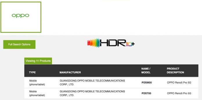 เว็บไซต์ขององค์กรที่ให้การรับรอง HDR10+ ได้รับรองสมาร์ตโฟน OPPO หมายเลขรุ่น PDSM00 และ PDST00 หรือ OPPO Reno5 Pro 5G จะมาพร้อมหน้าจอแสดงผลที่รองรับ HDR10+ แต่ไม่ได้เผยข้อมูลสเปกอื่นๆ