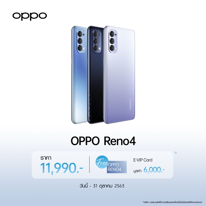 สำหรับใครที่ไม่อยากตกเทรนก็สามารถเป็นเจ้าของ OPPO Reno4 ได้แล้ววันนี้ในราคา 11,990 พร้อมรับทันทีของแถมสุดพิเศษต้อนรับ Reno Festival กับ E-VIP Card ประกันหน้าจอแตก ระยะเวลา 1 ปี มูลค่าถึง 6,000 บาท