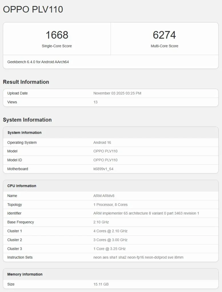 ล่าสุด หนึ่งในสมาร์ตโฟนตระกูล Reno15 ได้ปรากฏผลการทดสอบบนฐานข้อมูลออนไลน์ของ Geekbench ซึ่งเครื่องต้นแบบดังกล่าว ทำคะแนน Single-core ไปได้ 1,668 คะแนน และ Multi-core ที่ 6,274 คะแนน