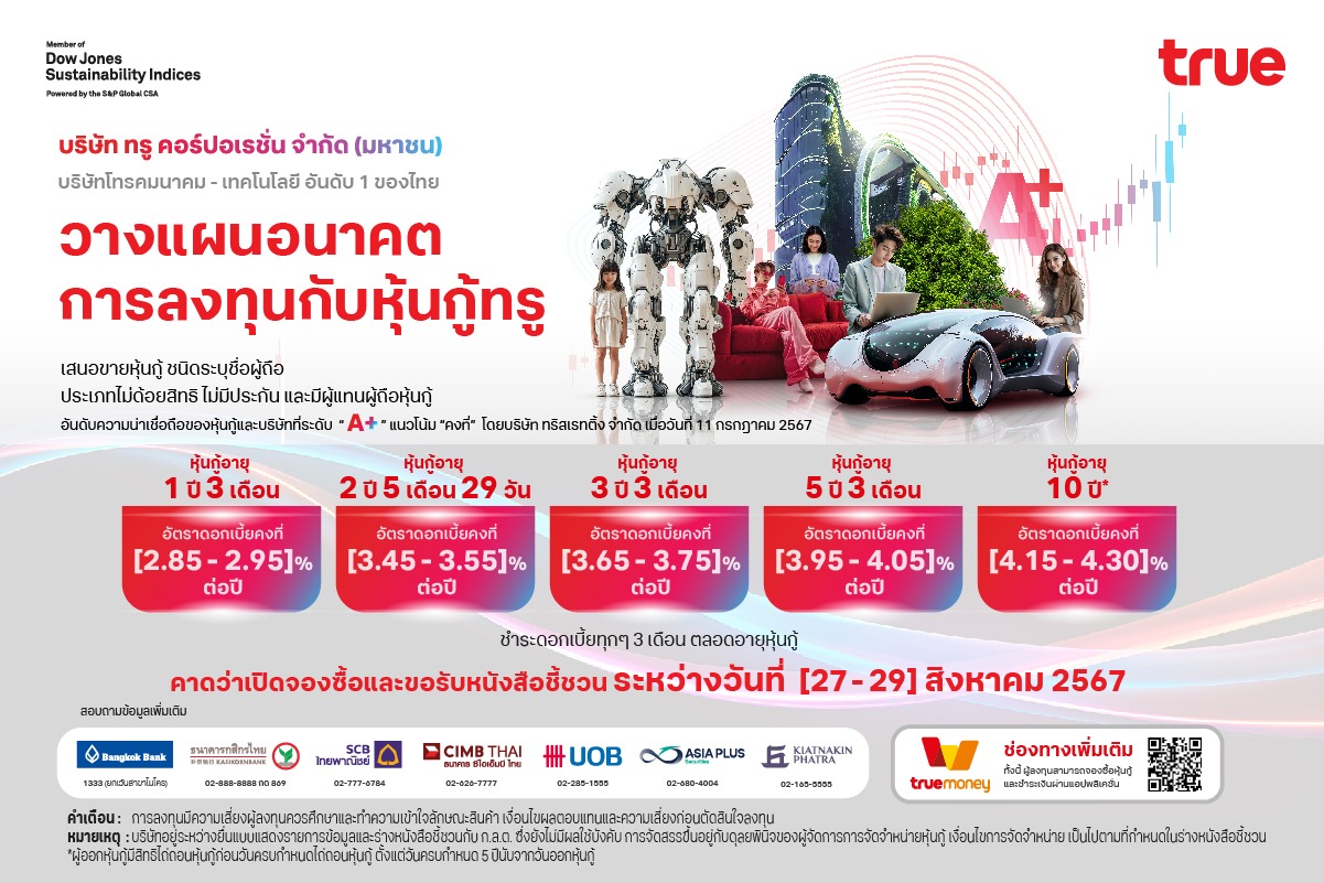 เตรียมเสนอขายหุ้นกู้ชุดใหม่ให้แก่ผู้ลงทุนทั่วไป จำนวน 5 ชุด อายุหุ้นกู้ตั้งแต่ 1 ปี 3 เดือน ถึง 10 ปี อัตราดอกเบี้ยคงที่ระหว่าง [2.85 – 4.30]% ต่อปี ด้วยอันดับความน่าเชื่อถือที่ระดับ “A+” แนวโน้ม “คงที่” (Stable) จากทริสเรทติ้ง สะท้อนถึงสถานะที่แข็งแกร่งของบริษัททรู คอร์ปอเรชั่นที่มีความมั่นคงทั้งในธุรกิจโทรคมนาคม และธุรกิจเทคโนโลยีดิจิทัล