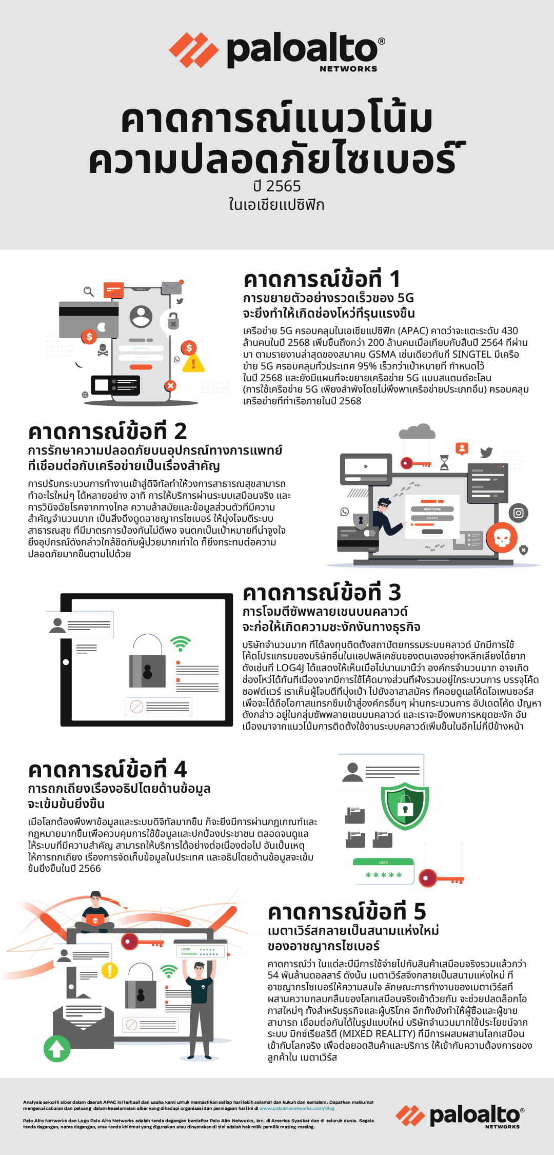 พาโล อัลโต้ เน็ตเวิร์กส์ เผยแนวโน้มด้านระบบรักษาความปลอดภัยไซเบอร์ที่สำคัญ และควรเฝ้าระวังในปี 2565 จำนวน 5 เรื่อง ดังนี้