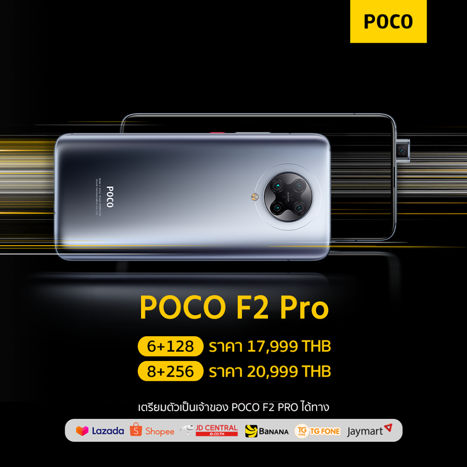 สำหรับ POCO F2 Pro รุ่นความจุ 8GB + 256GB จะวางจำหน่ายในราคา 20,999 บาท และวางจำหน่าย ณ ร้าน COM7, TG FONE, JAYMART, Mi Stores และร้านค้าที่ร่วมรายการ