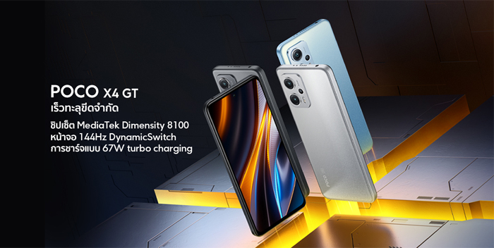 POCO พร้อมให้แฟนๆ และลูกค้าชาวไทยเป็นเจ้าของสมาร์ทโฟนรุ่นใหม่ POCO X4 GT สมาร์ทโฟนที่ชูสโลแกน ‘เร็วทะลุขีดจำกัด’ โดยเปิดให้สั่งจองล่วงหน้าในราคาพิเศษเพียง 9,990 บาท (จากราคาปกติ 10,990 บาท) สำหรับรุ่นความจุ 8GB+128GB และ 11,990 บาท (จากราคาปกติ 12,990 บาท) สำหรับรุ่นความจุ 8GB+256GB
