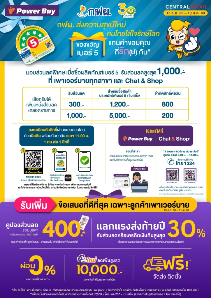 มอบสิทธิ์ส่วนลดสุดคุ้มสูงสุด 1,000 บาท สำหรับสินค้าประหยัดไฟเบอร์ 5 รวม 30,000 สิทธิ์ ระหว่างวันที่ 15 ธันวาคม 2568 – 13 มกราคม 2569 ที่ เพาเวอร์บายทุกสาขาทั่วประเทศ