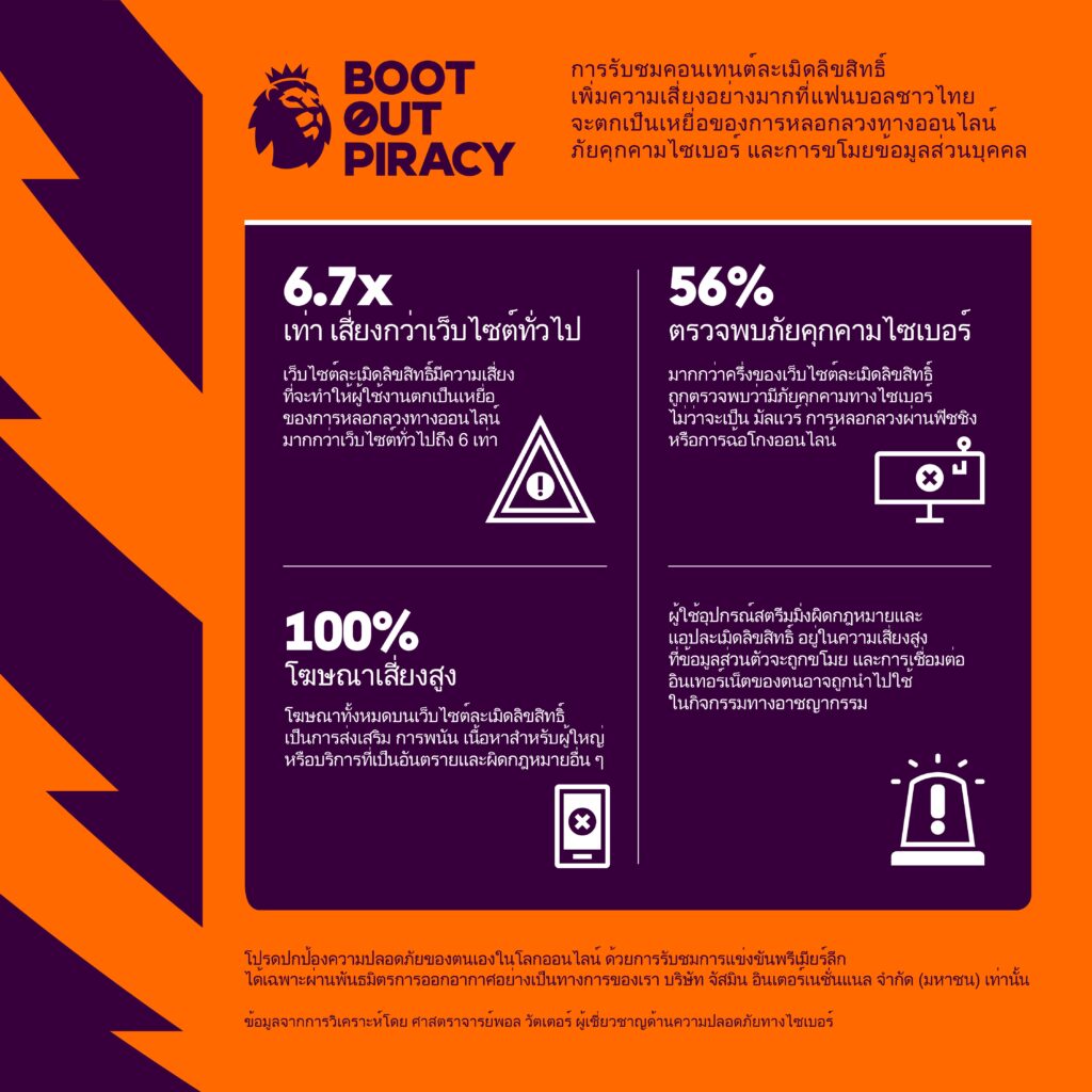 รวมทั้งเน้นย้ำการเข้าถึงเนื้อหาผ่านเว็บไซต์ละเมิดลิขสิทธิ์ และอุปกรณ์สตรีมมิ่งผิดกฎหมาย (ISDs) จะทำให้ผู้ใช้เผชิญกับความเสี่ยงอย่างมาก โดยเฉพาะอาชญากรไซเบอร์เหล่านี้ มักใช้แพลตฟอร์มผิดกฎหมายเหล่านี้ในการปล่อยมัลแวร์ ฟิชชิ่ง โจรกรรมข้อมูล และเผยแพร่เนื้อหาที่เป็นอันตรายหรือไม่เหมาะสมให้แก่แฟนบอลชาวไทย ซึ่งอาจคุกคามความปลอดภัยส่วนบุคคลและความปลอดภัยต่อครอบครัว