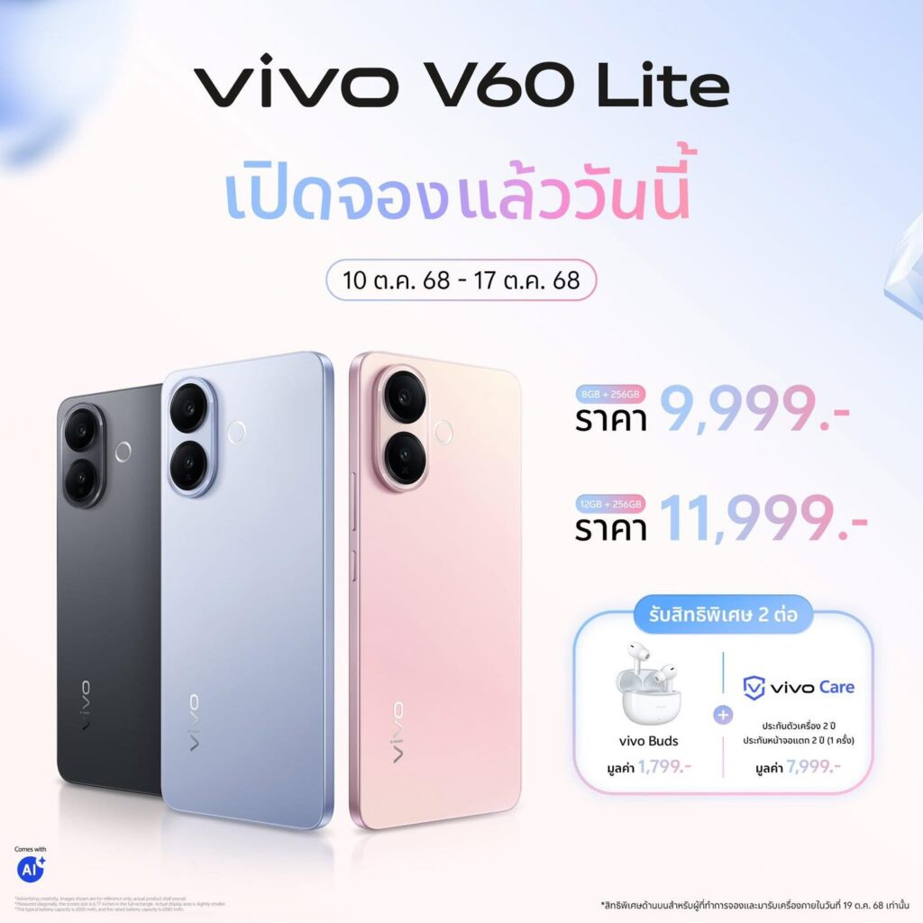 เปิดจองแล้ววันนี้ รับเครื่องก่อนใคร ใหม่! vivo V60 Lite มาพร้อมชิป Dimensity 7360-Turbo จอใหญ่ 6.77 นิ้ว 120Hz AMOLED แบต BlueVolt 6500mAh และชาร์จไว 90W FlashCharge ลุยต่อได้ทั้งวัน