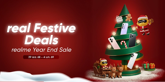 realme เดินหน้ามอบความสุขส่งท้ายปีให้แฟน ๆ ทั่วประเทศด้วยแคมเปญสุดยิ่งใหญ่ “real Festive Deals – Year End Sale” ชวนทุกคนมาเลือกสมาร์ตโฟนเป็นของขวัญปีใหม่ให้ตัวเองหรือคนพิเศษแบบจัดเต็มความคุ้ม ตั้งแต่วันที่ 29 พฤศจิกายน 2568 – 4 มกราคม 2569