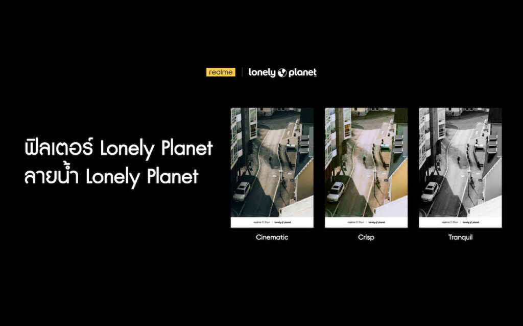 และเพื่อตอกย้ำว่า realme 11 Pro Series 5G เป็นสมาร์ตโฟนที่เหมาะสำหรับการท่องเที่ยวอย่างแท้จริง จึงได้ยกระดับการถ่ายภาพโดยเรียลมีได้ร่วมมือกับพาร์ทเนอร์ Lonely Planet นิตยสารคู่มือสำหรับนักเดินทางชื่อดัง โดยสามารถแต่งภาพด้วยลายน้ำจาก Lonely Planet และฟิลเตอร์หลากรูปแบบ (Cinematic, Crisp และ Tranquil) สร้างสรรค์ภาพถ่ายตามจินตนาการได้อย่างง่ายดายในขั้นตอนเดียว