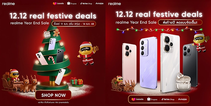 นอกจากโปรลดสุดคุ้มแล้ว realme ยังจัดหนักต่อด้วยคูปองพิเศษและของแถมเฉพาะรุ่นแบบจำนวนจำกัด พร้อม Flash Sale สุดเดือด ที่ยิงดีลออกมาเป็นระยะตลอดวันที่ 12–15 ธันวาคม ทำให้การช้อปสนุกลุ้นมันแบบไม่พัก! ผู้ใช้งานสามารถเก็บโค้ดลดเพิ่มได้ครบทุกแพลตฟอร์ม ไม่ว่าจะเป็น Lazada, Shopee, TikTok Shop หรือ Amaze รับประกันช้อปง่าย ของแท้ 100% จากร้านทางการ แถมบริการหลังการขายก็อุ่นใจสุด ๆ