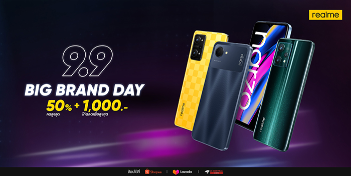 เตรียมช็อปกันให้กระจายกับขบวนไอทีทั้งสมาร์ตโฟนและแก็ดเจ็ตสุดล้ำที่ขนกันมาลดกระหน่ำสูงสุดถึง 50% !!! กับแคมเปญ “realme 9.9 Big Brand Day” ให้คุณจับจองผ่านแพลตฟอร์มร้านค้าออนไลน์ชั้นนำทั้ง Lazada, Shopee และ JD Central ในราคาพิเศษสุด ๆ