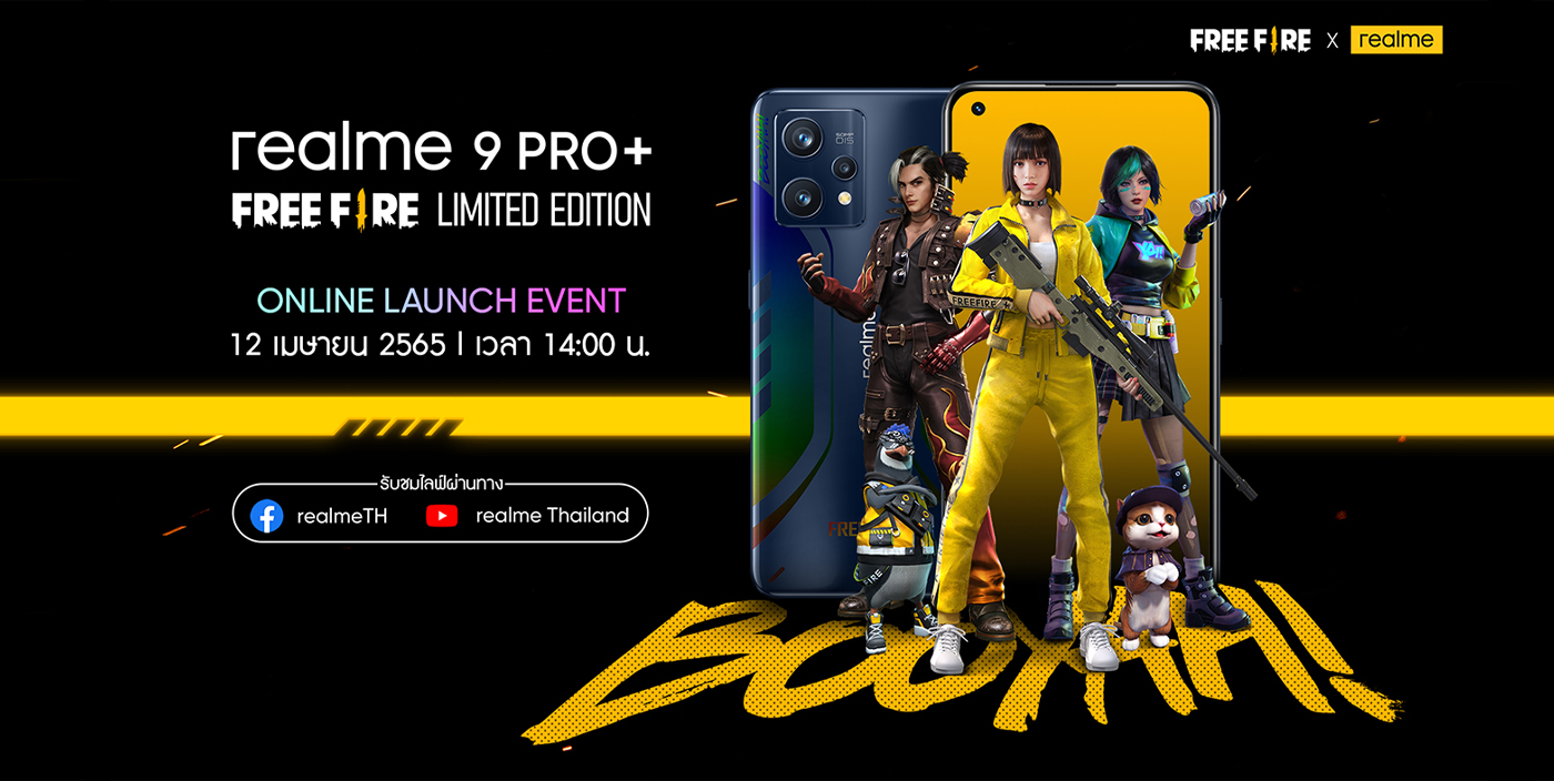 ติดตามพร้อมกันครั้งแรกของโลก กับ realme 9 Pro+ กับเวอร์ชั่น Free Fire Limited Edition กับการเปิดตัวรูปแบบออนไลน์ในประเทศไทย วันที่ 12 เมษายนนี้ ตั้งแต่เวลา 14.00 น. เป็นต้นไป บนแพลตฟอร์มโซเชียลมีเดียอย่างเป็นทางการของทาง realme ได้แก่ YouTube และ Facebook