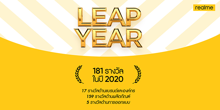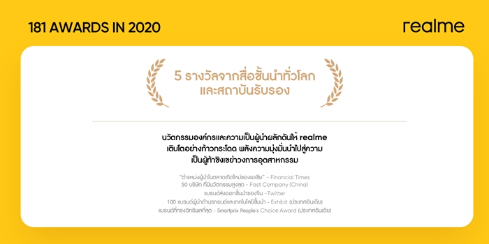 ปี 2020 ที่ผ่านมานับเป็นปีที่ต้องจดจำสำหรับ realme เนื่องจากกวาดรางวัลและสร้างชื่อเสียงระดับนานาชาติทั้งในด้านผลิตภัณฑ์ที่มีคุณภาพและการเติบโตที่สำคัญทางธุรกิจ โดยความสำเร็จของ realme ในปี 2020 แสดงให้เห็นถึงความแข็งแกร่งที่แท้จริงในทุก ๆ ด้าน ซึ่งไม่เพียงแต่การนำร่องพัฒนาผลิตภัณฑ์ในปี 2020 เท่านั้น แต่ยังรวมไปถึงการขยายธุรกิจที่เติบโตเหนือความคาดหมายของวงการอุตสาหกรรมอีกด้วย