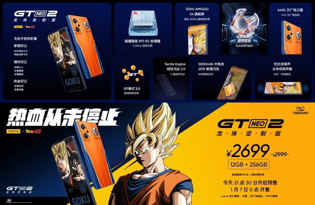realme ประกาศเปิดตัว realme GT Neo2 Dragon Ball Custom Version รุ่นลิมิเต็ด อิดิชั่น อย่างเป็นทางการที่ประเทศจีน โดยร่วมมือกับ Japan’s national treasure IP Dragon Ball ด้วยแรงบันดาลใจในการสร้างสรรค์ไอเดียผลิตภัณฑ์จากภายในสู่ภายนอก ด้วยภาพตัวละคร Dragon Ball สุดคลาสสิค ในการออกแบบผลิตภัณฑ์