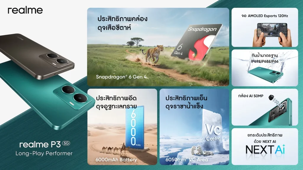 ส่วนรุ่นน้อง realme P3 5G ติดตั้งขุมพลัง Snapdragon® 6 Gen 4 ที่แรงที่สุดในระดับราคาเดียวกัน ผลิตด้วยเทคโนโลยี 4nm ที่เน้นประหยัดพลังงานแต่ให้พลังซีพียูเพิ่มขึ้น 15% ทำคะแนน Benchmark แตะ 760,000 พร้อมรองรับเกมยอดฮิตอย่าง Free Fire, HOK และ MLBB ที่เฟรมเรต 120FPS