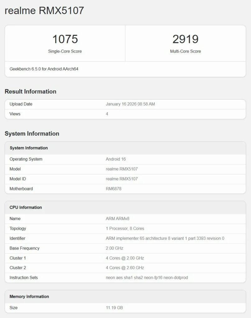 แม้ในรายการจะไม่ระบุชื่อชิปเซ็ตตรงๆ แต่จากข้อมูล CPU และ GPU ทำให้ยืนยันได้ว่า realme P4 Power จะขับเคลื่อนด้วยชิป MediaTek Dimensity 7400