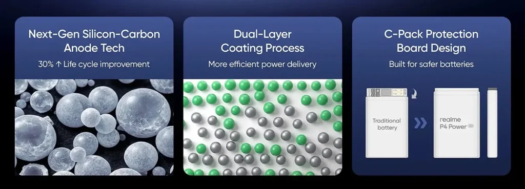 1. แบตเตอรี่ 10,001 mAh ที่อึดที่สุดในคลาส ด้วยเทคโนโลยีแบตเตอรี่ Silicon-Carbon ยุคใหม่ ทำให้ Realme P4 Power การันตีอายุการใช้งานยาวนาน โดยแบตเตอรี่จะยังเก็บไฟได้ถึง 80% แม้ผ่านไป 8 ปี (รองรับการชาร์จถึง 1,650 รอบ)