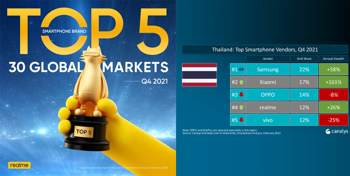 โดยล่าสุด จากข้อมูลล่าสุดของ Canalys พบว่า ในไตรมาสที่ 4 ของปี 2564 realme มีส่วนแบ่งการตลาดอยู่ในอันดับที่ 5 กว่า 30 ตลาด ใน 6 ภูมิภาคทั่วโลก โดยมีตลาดใหม่ๆ ที่ติดอันดับในครั้งนี้ด้วย ได้แก่ เยอรมนี เปรู โคลอมเบีย และภูมิภาคยุโรปตะวันตกในยุโรป