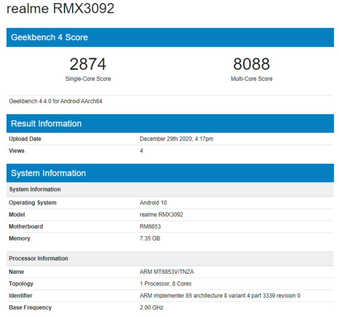 สำหรับสเปกของ realme หมายเลชรุ่น RMX3092 ซึ่งคาดว่าจะเป็น realme 8 ที่ปรากฎบนแอป GeekBench 4.4.0 ใช้หน่วยประมวลผลซีพียูแบบ Octa Core ความเร็ว 2.0GHz, มาพร้อมกับเมนบอร์ด “RM6853” ที่เป็นโคดเนมของชิปเซ็ท Dimensity 720 รองรับ 5G จับคู่กับ RAM 8GB, รันบนระบบปฎิบัติการ Android 10 และเป็นผลทดสอบเมื่อวันที่ 29 ธันวาคมที่ผ่านมา