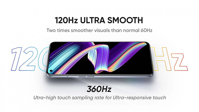 ในภาพทีเซอร์ยังเผยให้เห็นภาพเรนเดอร์ของ realme X7 Max โดยด้านหน้ามาพร้อมหน้าจอแสดงผลแบบ Punch Hole Display เจาะรูฝังกล้องเซลฟี่ที่มุมซ้ายด้านบน