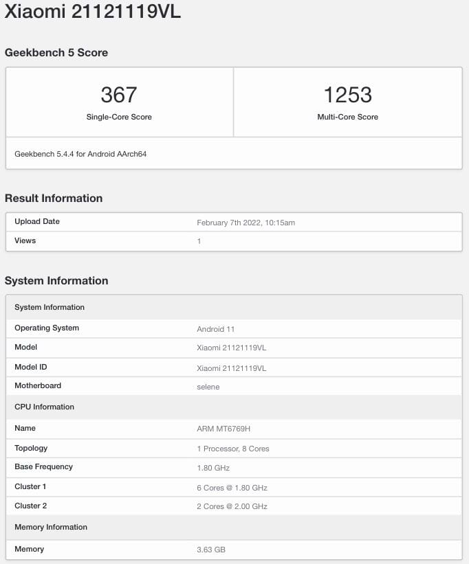 สำหรับสเปกของ Xiaomi หมายเลขรุ่น 21121119VL ซึ่งคาดว่าจะเป็น Redmi 10 (2022) ที่ปรากฎบนแอป GeekBench 5 ใช้หน่วยประมวลผลซีพียูแบบ Octa Core ความเร็ว 1.80GHz มาพร้อมชิปเซ็ท Helio G88 (หมายเลขรุ่น MT6769H) ของ MediaTek จับคู่กับ RAM 4GB, รันบนระบบปฎิบัติการ Android 11 และเป็นผลทดสอบสดๆ ร้อนๆ เมื่อวันที่ 7 กุมภาพันธ์ 2565 ที่ผ่านมา