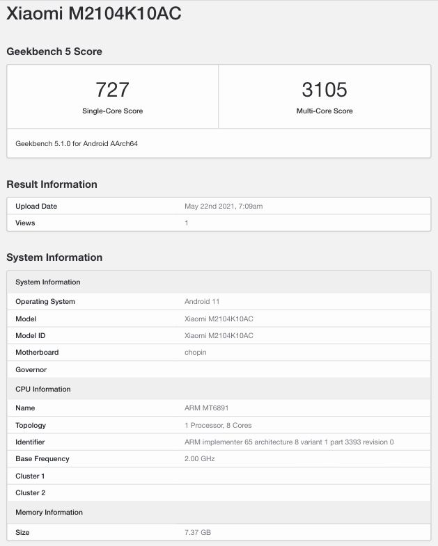 สำหรับสเปกของ Xiaomi หมายเลขรุ่น M2104K10AC ที่ปรากฎบนแอป GeekBench 5 ซึ่งคาดว่าจะเป็น Redmi K40 Light Luxury Edition ใช้หน่วยประมวลผลซีพียูแบบ Octa Core ความเร็ว 2.00GHz, มาพร้อมกับมาเธอร์บอร์ด chopin ซึ่งเป็นโคคเนมของชิปเซ็ท MediaTek Dimensity 110 จับคู่กับ RAM 8GB, รันบนระบบปฎิบัติการ Android 11 และเป็นผลทดสอบสดๆ ร้อนๆ เมื่อวันที่ 22 พฤษภาคม 2021 ที่ผ่านมา