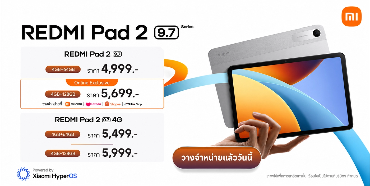 - REDMI Pad 2 9.7 รุ่นความจุ 4GB+128GB11 วางจำหน่ายในราคา 5,699 บาท ที่ mi.com, Lazada, Shopee และ TikTok Shop เท่านั้น12