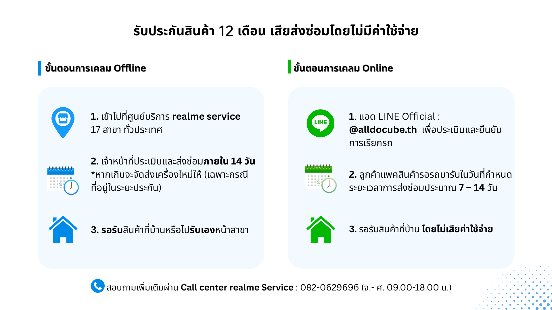 เสียส่งซ่อมโดยไม่มีค่าใช้จ่าย ทั้งออนไลน์ หรือ realme Service 17 สาขาทั่วประเทศ จัดจำหน่ายที่ร้านค้าชั้นนำทั่วประเทศใกล้บ้านคุณ หรือสั่งซื้อออนไลน์ได้ง่าย ๆ ผ่านทาง