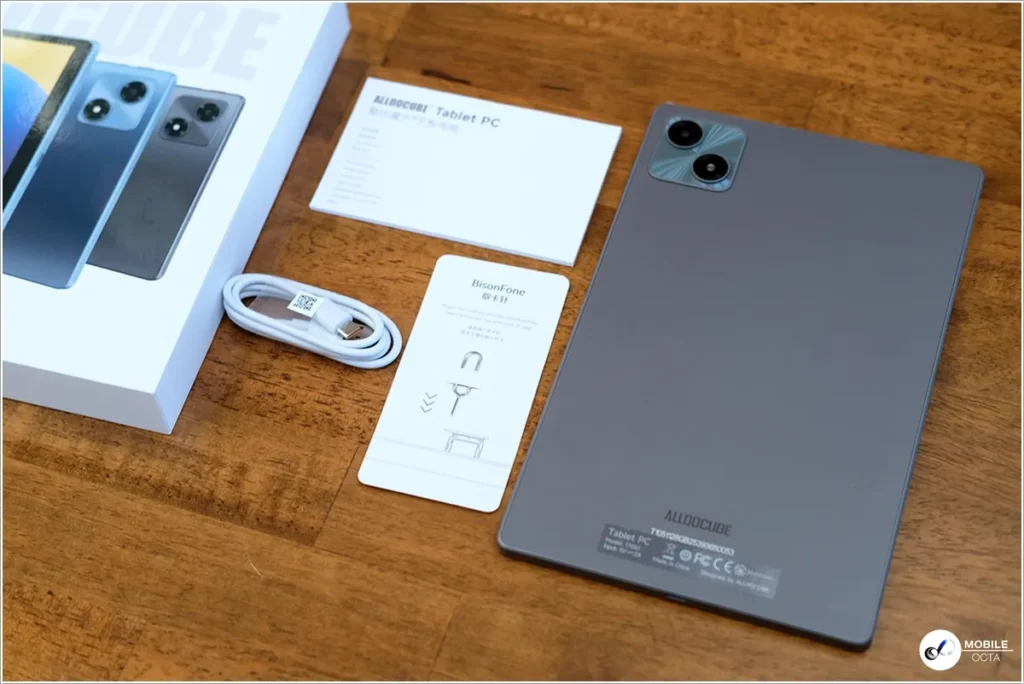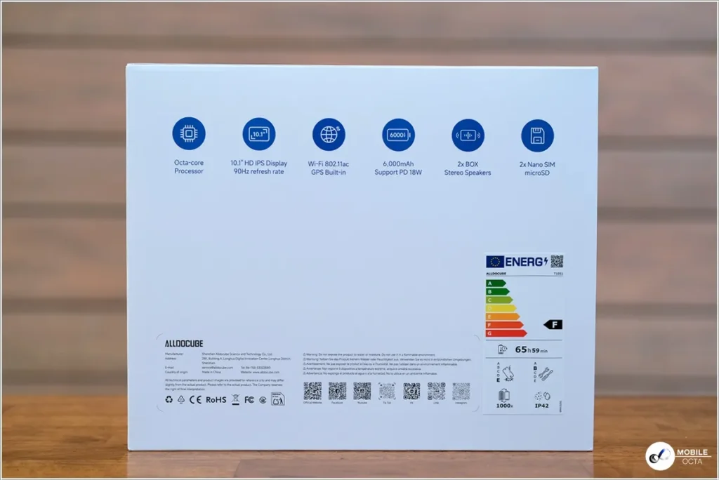 ด้านหลังกล่องมีสเปกเด่น ข้อมูลผู้ผลิต พร้อม QR Code ช่องทางติดต่อสังคมออนไลน์ต่าง ๆ ของ Alldocube และได้รับการรับรองประสิทธิภาพจาก ENERG
