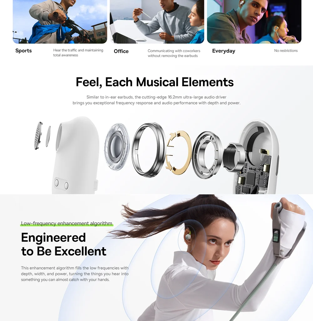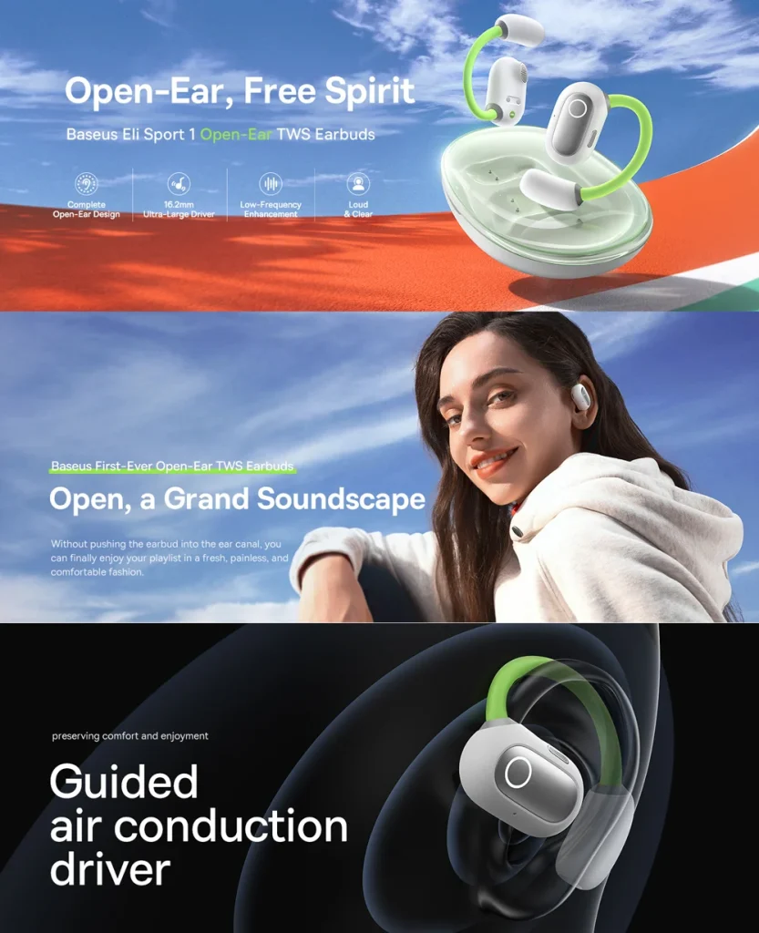 Baseus Eli Sport 1 ใช้เทคโนโลยีการนำอากาศเพื่อลดความรู้สึกไม่สบายที่เกิดจากทางเลือกอื่นด้วยเทคโนโลยีการนำกระดูก คุณจะเพลิดเพลินไปกับประสบการณ์เสียงที่ชัดขึ้นเทียบเท่ากับหูฟังแบบอินเอียร์และหูฟังครอบหูแบบดั้งเดิม