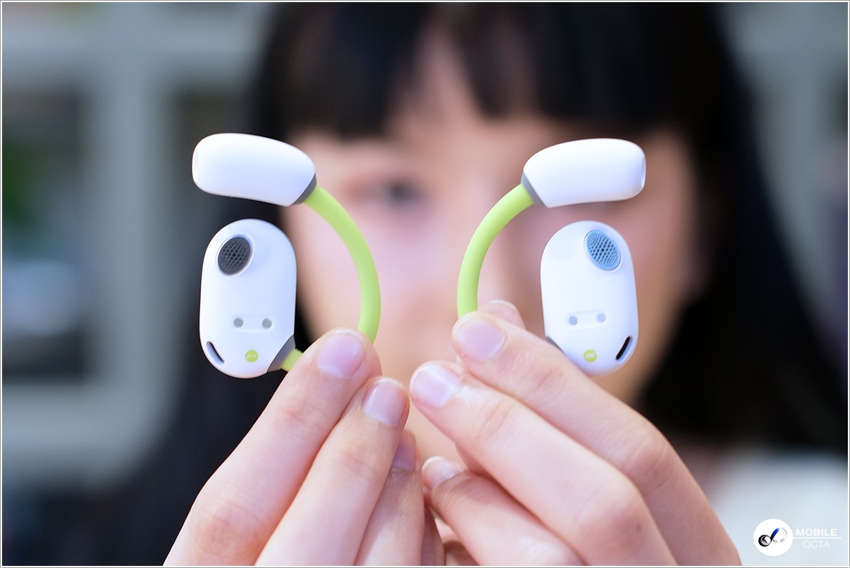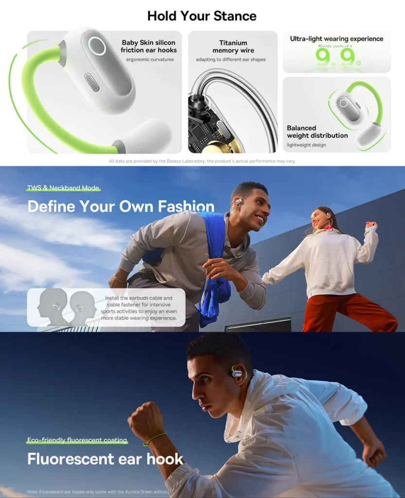 ตัวหูฟังใช้วัสดุซิลิโคนที่เป็นมิตรต่อผิวหนัง ใส่ได้นานไม่รู้สึกระคายเคือง พร้อมลวดโลหะผสมไททาเนียมแบบหน่วยความจำปรับให้เข้ากับรูปทรงหูต่างๆ เพื่อให้สวมใส่ได้กระชับ และที่เกี่ยวหูแบบเรืองแสงที่เป็นมิตรกับสิ่งแวดล้อมช่วยให้มองเห็นได้ชัดเจนระหว่างการออกกำลังกายในเวลากลางคืน